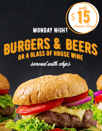 Join us on Monday nights and select from 3 delicious burger options, and a tap beer or house wine for only $15 for Members! Use the Club Info tab to become a member today!